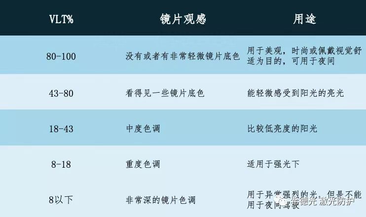 然后便是VLT,英文全稱是Visible Light Transmission,中文名叫可見(jiàn)光透過(guò)率,簡(jiǎn)單說(shuō)就是鏡片能透過(guò)多少可見(jiàn)光。那什么是可見(jiàn)光呢?百度百科的解釋是:可見(jiàn)光是電磁波譜中人眼可以感知的部分,可見(jiàn)光譜沒(méi)有精確的范圍;一般人的眼睛可以感知的電磁波的頻率在380~750THz,波長(zhǎng)在780~400nm之間,也就是大家日常能看見(jiàn)顏色的光,比如大家常聽(tīng)說(shuō)的450nm(藍(lán)光),532nm(綠光),600nm(紅光)等,但是很多光纖激光就是不可見(jiàn)光,如1064nm,因?yàn)榇蠖鄶?shù)光線激光波長(zhǎng)都大于800nm。回到VLT,如果產(chǎn)品標(biāo)注70%VLT,也就意味著有70%的可見(jiàn)光可以透過(guò)。這個(gè)概念如果大家平時(shí)不太留意的話會(huì)覺(jué)得有點(diǎn)抽象,但是這個(gè)影響著一些工作的細(xì)致操作,比如激光器矯正,設(shè)備檢查,故障排除,以及醫(yī)用激光的激光手術(shù)等操作,這也是為什么醫(yī)用激光防護(hù)鏡普遍都有著更高的VLT。以下是一個(gè)大概的不同VLT的視覺(jué)感受,大家可以作為參考:
